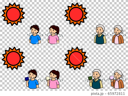 太陽の日差しが強く暑い中マスクをつけて熱中症になりそうな人々のイラスト素材
